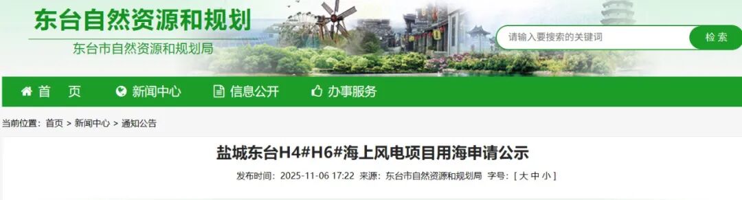 11月6日,江蘇省鹽城市東臺市自然資源和規(guī)劃局發(fā)布《鹽城東臺H4#H6#海上風(fēng)電項(xiàng)目用海申請公示》。
