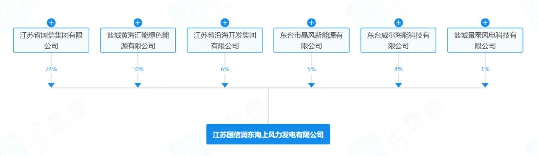 企查查顯示,江蘇國信潤東海上風(fēng)力發(fā)電有限公司成立于2025年10月31日,注冊資本為67500萬元,由江蘇省國信集團(tuán)有限公司(74.00%)、鹽城黃海匯能綠色能源有限公司(10.00%)、江蘇省沿海開發(fā)集團(tuán)有限公司(6.00%)、東臺市晶風(fēng)新能源有限公司(5.00%)、東臺威爾海能科技有限公司(4.00%)、鹽城景泰風(fēng)電科技有限公司(1.00%)共同持股。