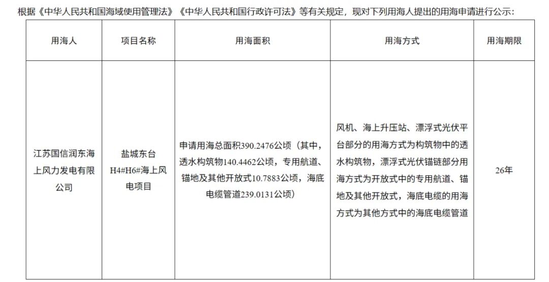 根據(jù)公示,用海人:江蘇國信潤東海上風(fēng)力發(fā)電有限公司。