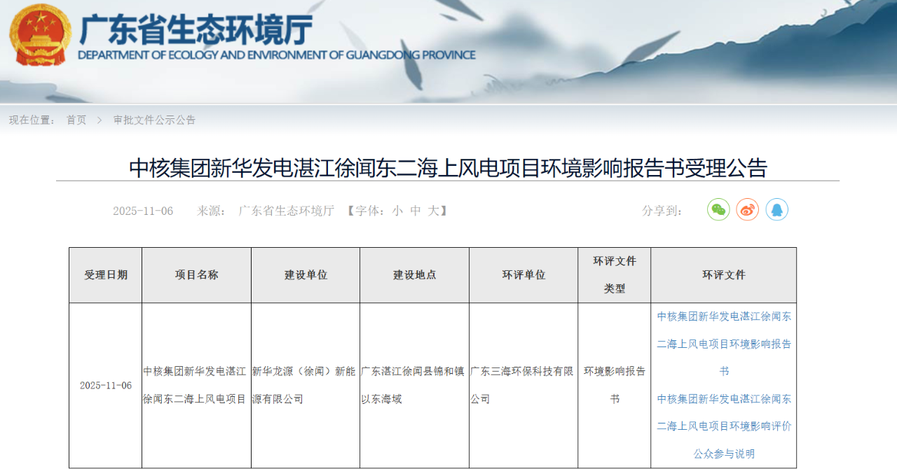 近日,廣東省生態(tài)環(huán)境廳發(fā)布《中核集團(tuán)新華發(fā)電湛江徐聞東二海上風(fēng)電項(xiàng)目環(huán)境影響報(bào)告書(shū)受理公告》。