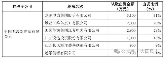 2. 射陽(yáng)龍?jiān)葱履茉从邢薰荆糊堅(jiān)措娏Τ鲑Y0.31億元占股31%,遠(yuǎn)景能源出資100萬(wàn)元占股1%,其余股份由雄亞(維爾京)有限公司等4家公司持有,對(duì)應(yīng)射陽(yáng)海上南區(qū)H7#75萬(wàn)千瓦風(fēng)電項(xiàng)目。