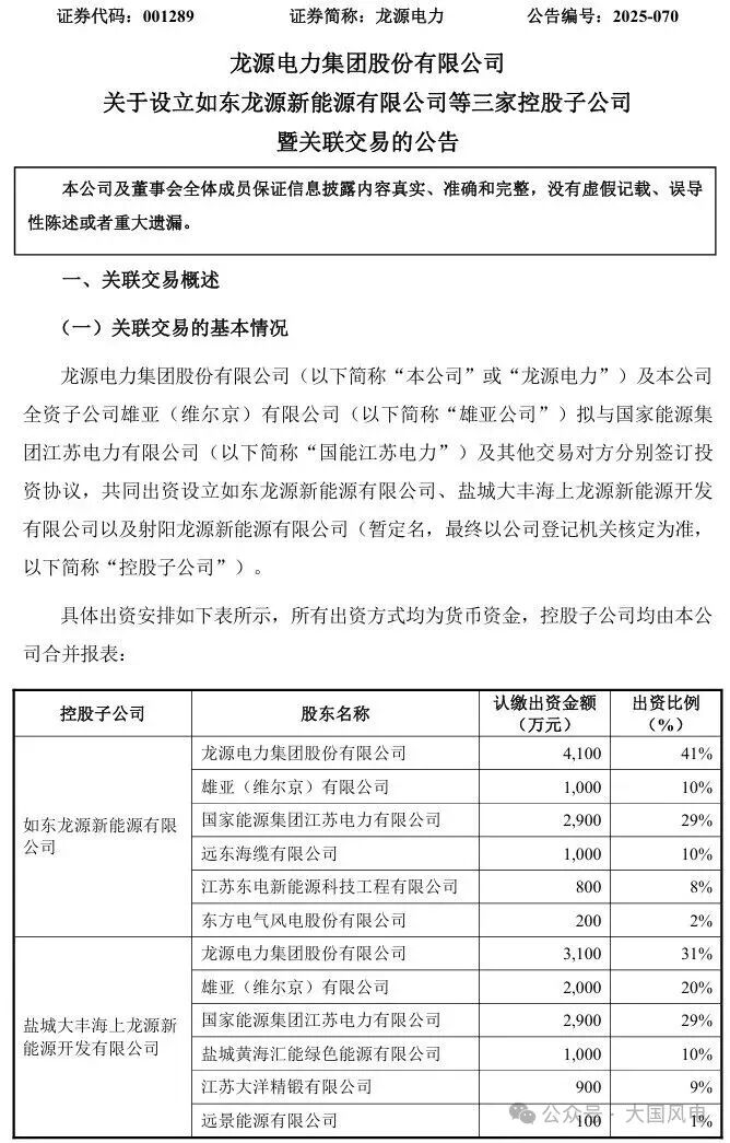 1. 如東龍?jiān)葱履茉从邢薰荆糊堅(jiān)措娏Τ鲑Y0.41億元占股41%,東方風(fēng)電出資200萬(wàn)元占股2%,另有雄亞(維爾京)有限公司、國(guó)家能源集團(tuán)江蘇電力有限公司等4家公司共同參股,將用于開(kāi)發(fā)江蘇如東H16#15萬(wàn)千瓦風(fēng)電項(xiàng)目。
