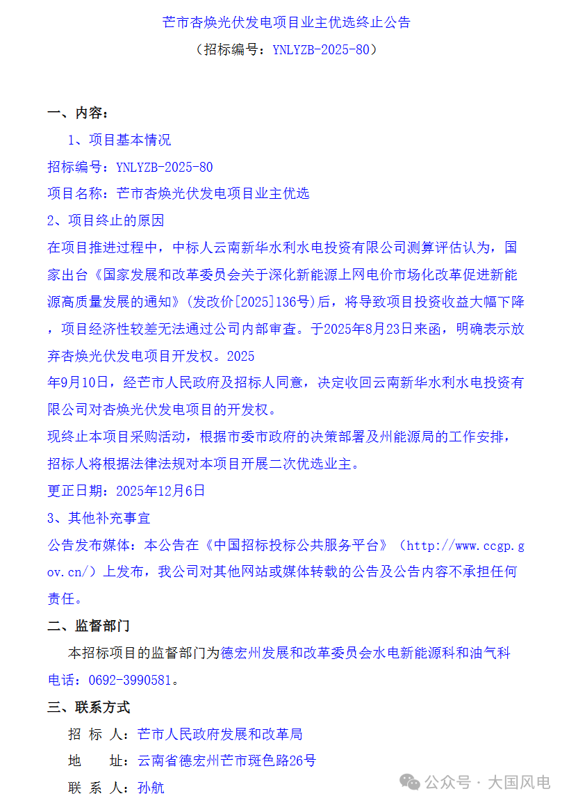 12月6日,云南芒市發(fā)改委發(fā)布芒市杏煥光伏發(fā)電項目業(yè)主優(yōu)選終止公告,該項目裝機容量為70MW,于5月29日公布中標結(jié)果,中標人為云南新華水利水電投資有限公司,為中核集團下屬公司。