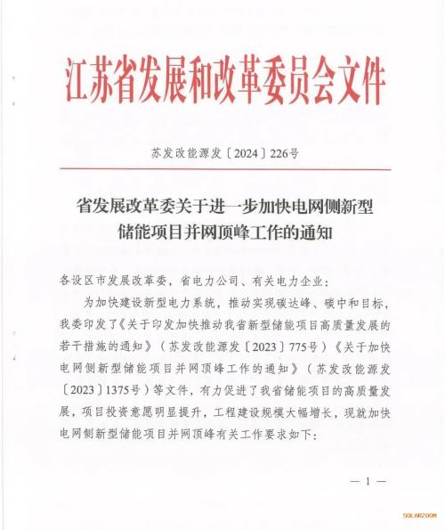 近日,江蘇省發(fā)改委發(fā)布關(guān)于進(jìn)一步加快電網(wǎng)側(cè)新型儲(chǔ)能項(xiàng)目并網(wǎng)頂峰工作的通知(蘇發(fā)改能源發(fā)〔2024〕226號(hào))。通知表示,經(jīng)多次協(xié)調(diào)和反復(fù)梳理,全省41個(gè)已納規(guī)的電網(wǎng)側(cè)新型儲(chǔ)能項(xiàng)目自愿承諾確保在2024年7月15日前建成并網(wǎng),項(xiàng)目容量共計(jì)約400萬(wàn)千瓦。