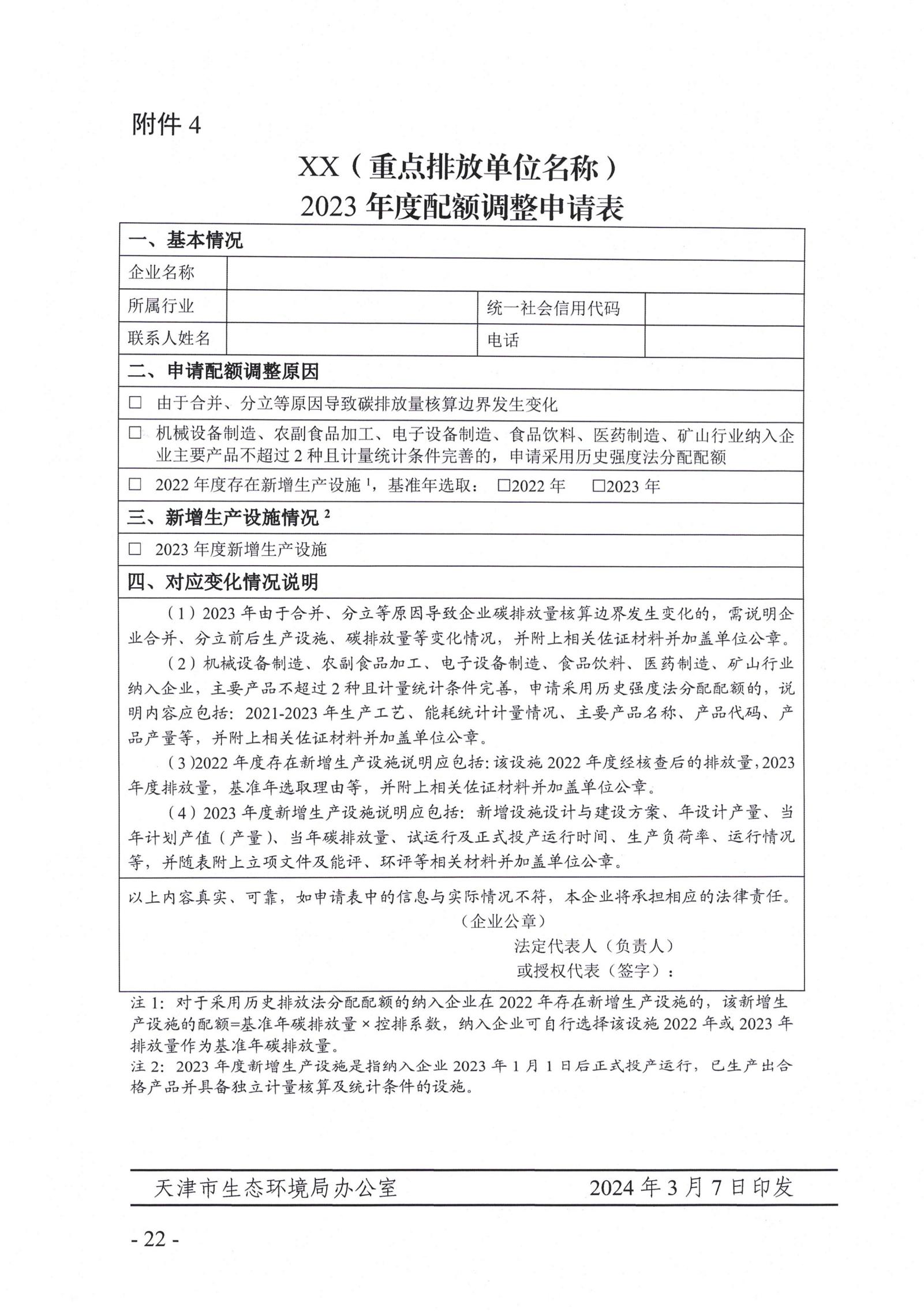 (一)配額調整。存在核算邊界發(fā)生變化等情況的納入企業(yè),可填寫2023年度配額調整申請表(詳見附件4)申請配額調整,并于核查前將申請表(包括電子版、蓋章掃描件)與碳排放報告一起報送區(qū)生態(tài)環(huán)境局,紙質件待現(xiàn)場核查時提交核查機構查驗。
