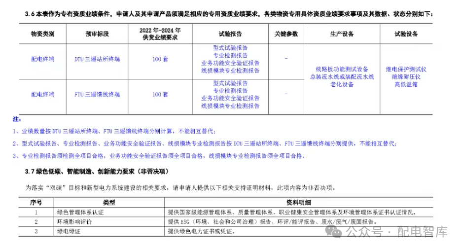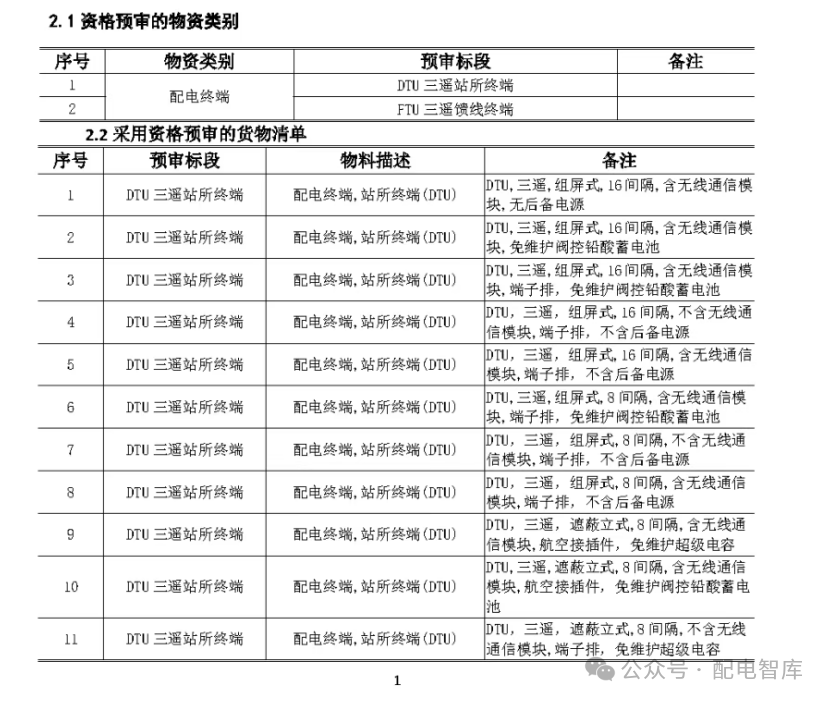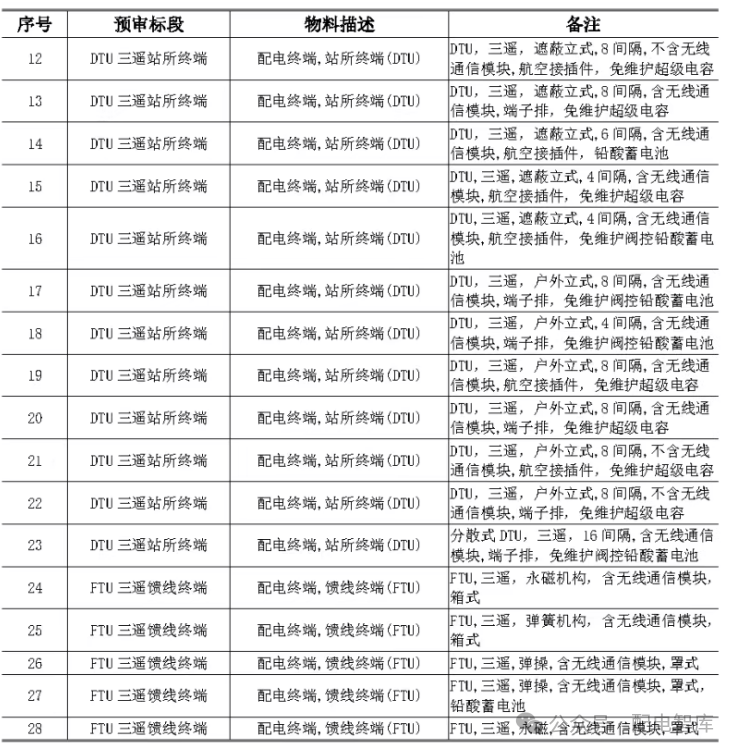 本次資格預(yù)審的物資類別主要為配電終端,具體包括DTU三遙站所終端和FTU三遙饋線終端等多種型號(hào)。