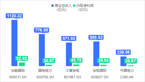 其中,華能?chē)?guó)際以營(yíng)收1120.32億元、歸母凈利潤(rùn)92.62億元高居榜首,成為五大企業(yè)中唯一營(yíng)收破千億、盈利近百億的上市公司。