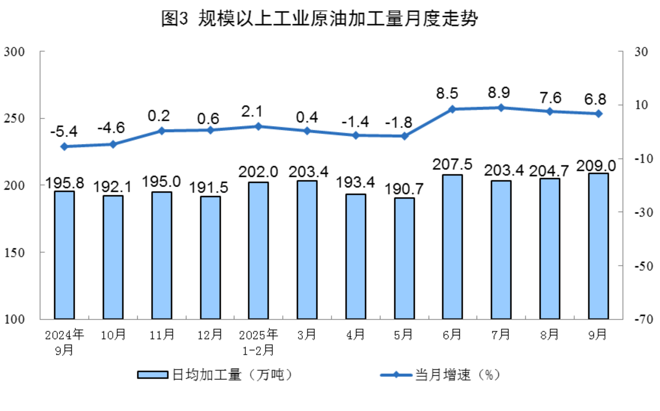 原油加工較快增長(zhǎng)。9月份,規(guī)上工業(yè)原油加工量6269萬(wàn)噸,同比增長(zhǎng)6.8%;日均加工209.0萬(wàn)噸。