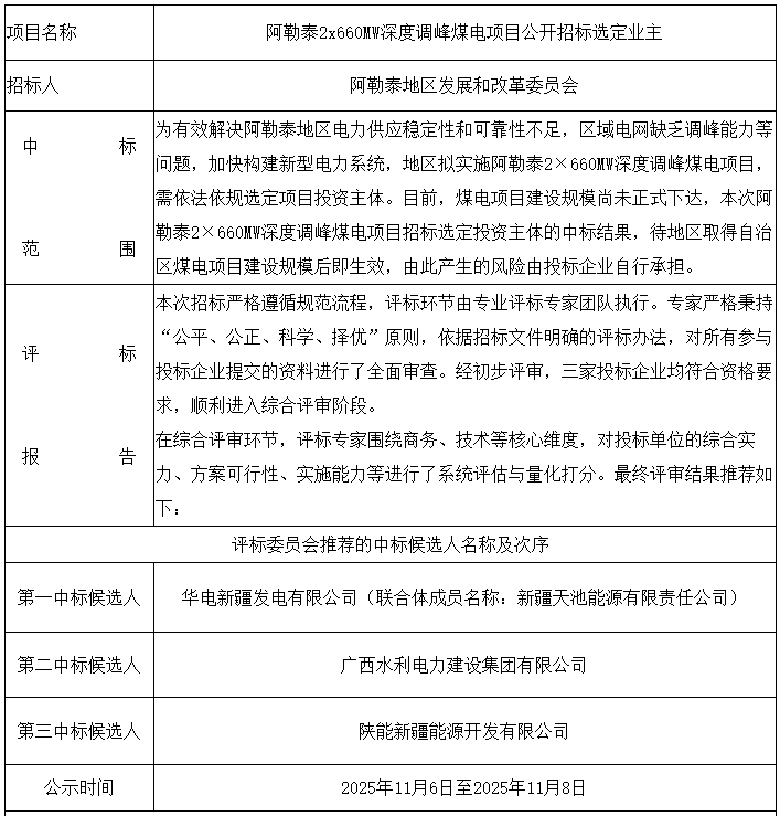 近日,阿勒泰2x660MW深度調(diào)峰煤電項(xiàng)目公開(kāi)招標(biāo)選定業(yè)主中標(biāo)候選人公示。華電新疆發(fā)電有限公司(聯(lián)合體成員名稱:新疆天池能源有限責(zé)任公司)預(yù)中標(biāo)該項(xiàng)目。