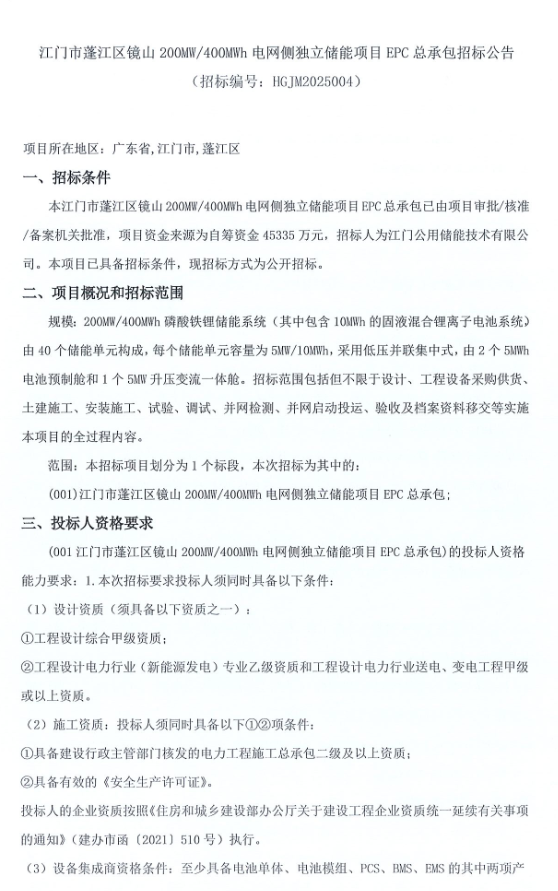 11月10日,江門(mén)公用儲(chǔ)能技術(shù)有限公司發(fā)布江門(mén)市蓬江區(qū)鏡山200MW/400MWh電網(wǎng)側(cè)獨(dú)立儲(chǔ)能項(xiàng)目EPC總承包招標(biāo)公告。項(xiàng)目位于廣東省江門(mén)市蓬江區(qū),項(xiàng)目規(guī)模為200MW/400MWh,采用磷酸鐵鋰儲(chǔ)能系統(tǒng)(其中包含10MWh的固液混合鋰離子電池系統(tǒng)),由40個(gè)儲(chǔ)能單元構(gòu)成,每個(gè)儲(chǔ)能單元容量為5MW/10MWh,采用低壓并聯(lián)集中式,由2個(gè)5MWh電池預(yù)制艙和1個(gè)5MW 升壓變流一體艙。招標(biāo)范圍包括但不限于設(shè)計(jì)、工程設(shè)備采購(gòu)供貨、土建施工、安裝施工、試驗(yàn)、調(diào)試、并網(wǎng)檢測(cè)、并網(wǎng)啟動(dòng)投運(yùn)、驗(yàn)收及檔案資料移交等實(shí)施本項(xiàng)目的全過(guò)程內(nèi)容。