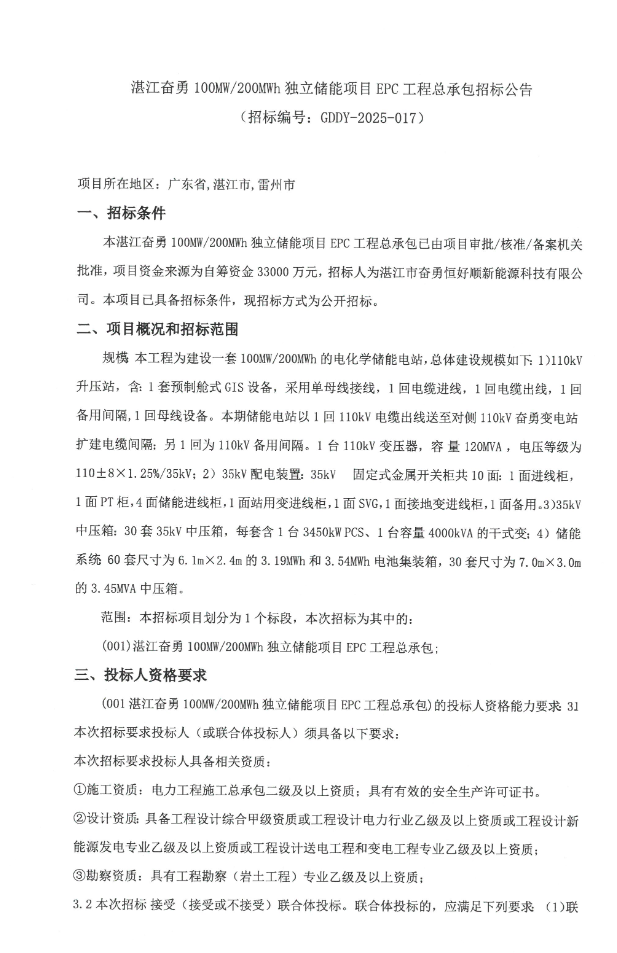 11月14日,湛江市奮勇恒好順新能源科技有限公司發(fā)布湛江奮勇100MW/200MWh獨(dú)立儲(chǔ)能項(xiàng)目EPC工程總承包招標(biāo)公告。項(xiàng)目位于廣東省湛江市雷州市,建設(shè)一套100MW/200MWh的電化學(xué)儲(chǔ)能電站。