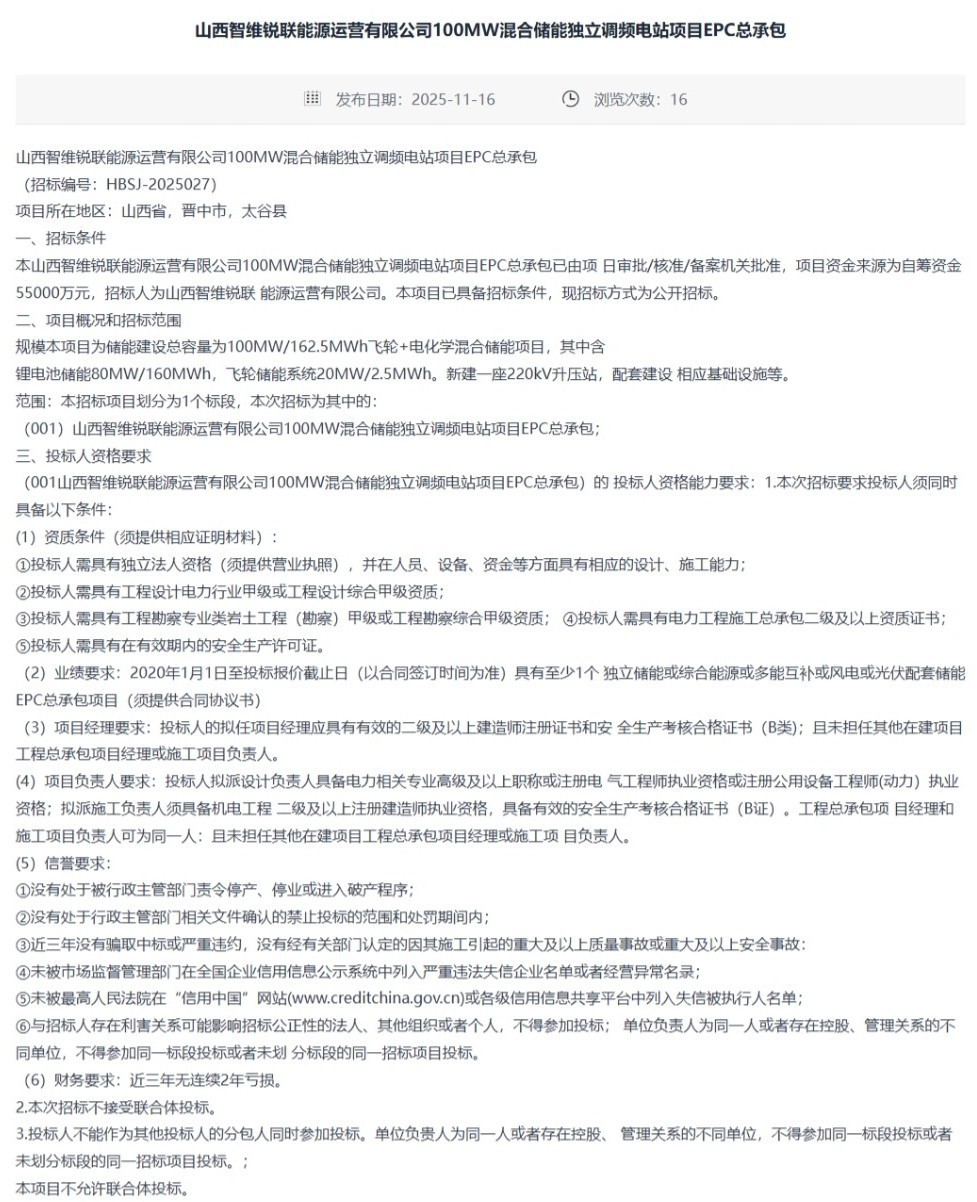 11月16日,山西智維銳聯(lián)能源運(yùn)營(yíng)有限公司100MW混合儲(chǔ)能獨(dú)立調(diào)頻電站項(xiàng)目EPC總承包公開招標(biāo)公告發(fā)布,項(xiàng)目位于山西省晉中市太谷縣,總投資5.5億元,資金來源為自籌資金,招標(biāo)人為山西智維銳聯(lián)能源運(yùn)營(yíng)有限公司,招標(biāo)方式為公開招標(biāo)。