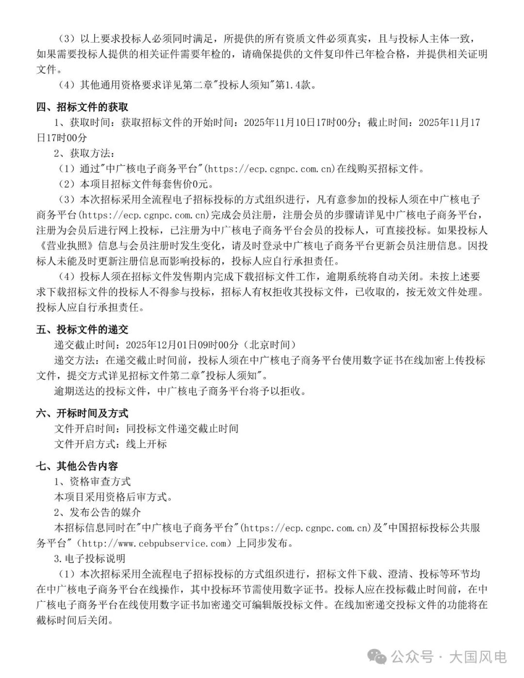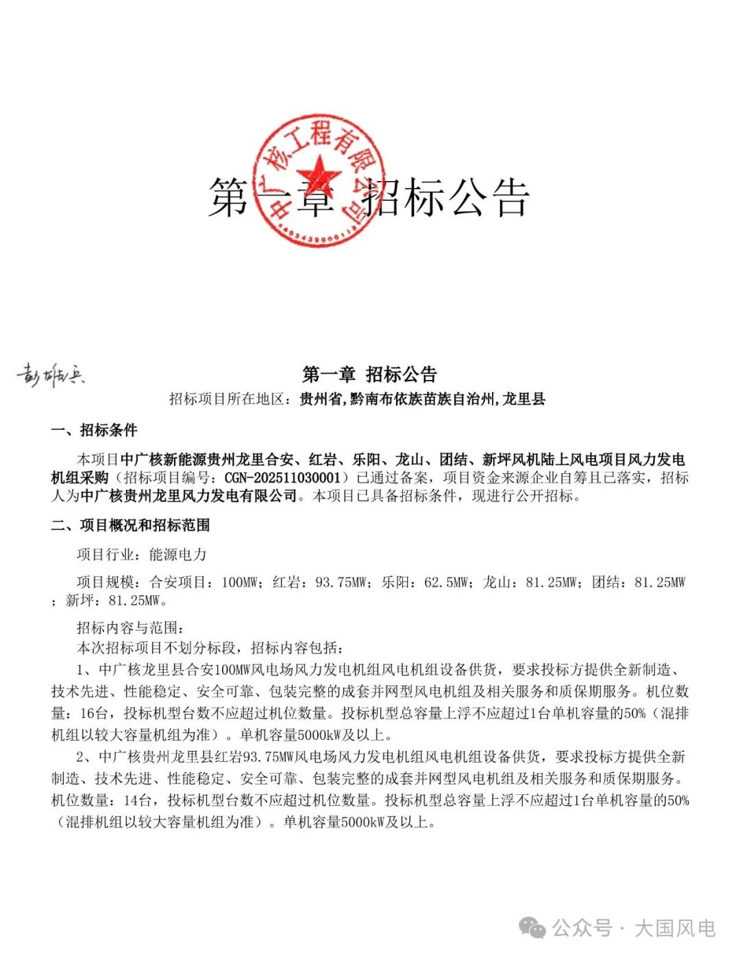 3、中廣核貴州龍里縣樂陽62.5MW風電場風力發(fā)電機組風電機組設(shè)備供貨,要求投標方提供全新制造、技術(shù)先進、性能穩(wěn)定、安全可靠、包裝完整的成套并網(wǎng)型風電機組及相關(guān)服務(wù)和質(zhì)保期服務(wù)。機位數(shù)量:7臺,投標機型臺數(shù)不應超過機位數(shù)量。投標機型總?cè)萘可细〔粦^1臺單機容量的50%(混排機組以較大容量機組為準)。單機容量5000kW及以上。