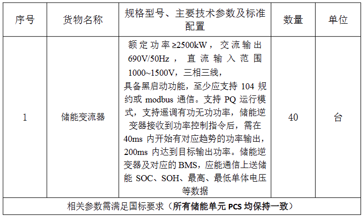 11月20日,中國(guó)電建電建裝備公司2025年11月第三批儲(chǔ)能變流器采購(gòu)項(xiàng)目公開(kāi)詢比采購(gòu)公告發(fā)布。項(xiàng)目采購(gòu)額定功率 ≥2500kW的儲(chǔ)能變流器40臺(tái),采購(gòu)規(guī)模為100MW。儲(chǔ)能變流器 交流輸出690V/50Hz , 直流輸入范圍1000~1500V,三相三線,具備黑啟動(dòng)功能,至少應(yīng)支持 104 規(guī)約或 modbus 通信。支持 PQ 運(yùn)行模式,支持遙調(diào)有功無(wú)功功率,儲(chǔ)能逆變器接收到功率控制指令后,需在40ms 內(nèi)開(kāi)始有對(duì)應(yīng)趨勢(shì)的功率輸出,200ms 內(nèi)達(dá)到目標(biāo)輸出功率。儲(chǔ)能逆變器及對(duì)應(yīng)的BMS,應(yīng)能通信上送儲(chǔ)能 SOC、SOH、最高、最低單體電壓等數(shù)據(jù)。