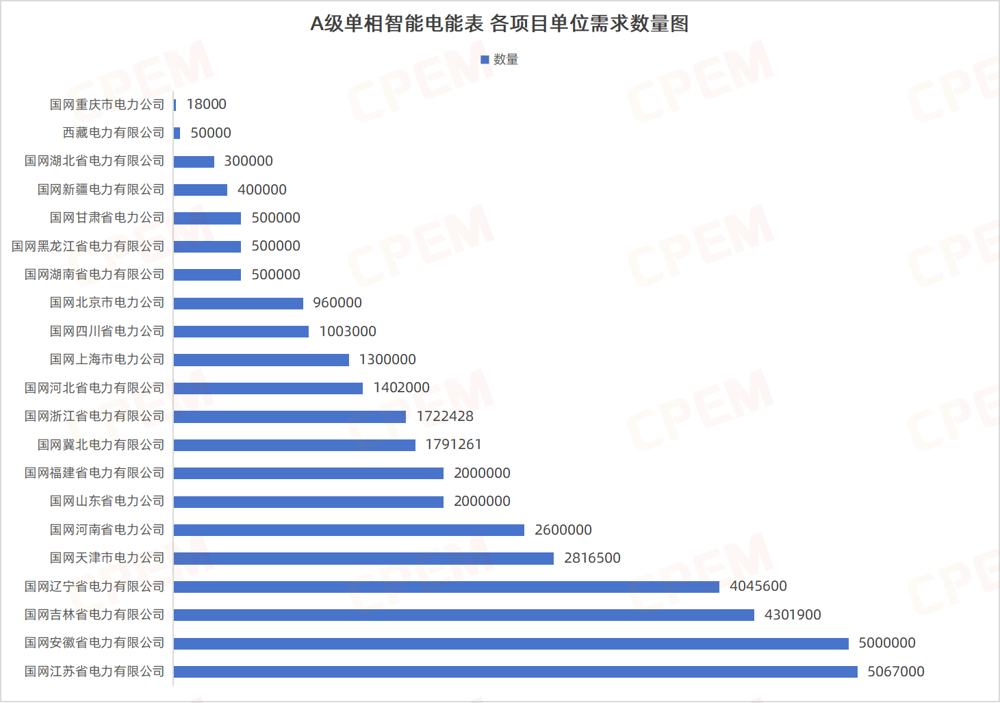 A級單相智能電能表招標(biāo)項目單位共計21個,其中國國網(wǎng)江蘇省電力有限公司、國網(wǎng)安徽省電力有限公司、國網(wǎng)吉林省電力有限公司三個項目單位需求數(shù)量分列前三,單相智能電能表,A級,遠程,內(nèi)置,有,220V,5A該款產(chǎn)品的需求量最大,達35464761臺。