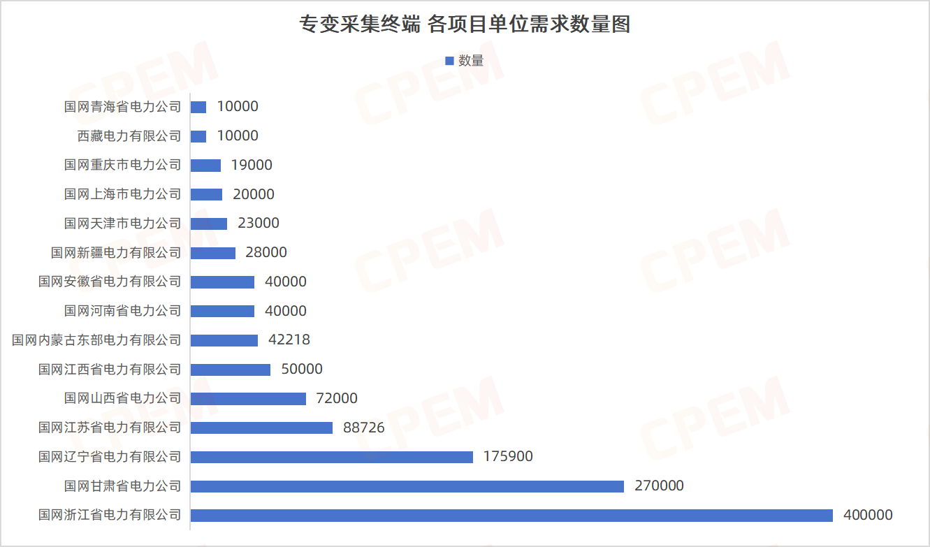 專變采集終端招標(biāo)項目單位共計15個,其國網(wǎng)浙江省電力有限公司、國網(wǎng)甘肅省電力公司、國網(wǎng)遼寧省電力有限公司三個項目單位需求數(shù)量分列前三,專變采集終端,III型,4G,有,4,C3該款產(chǎn)品的需求量最大,達288939臺。