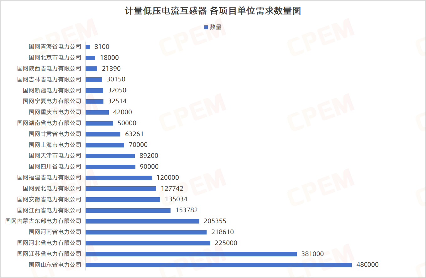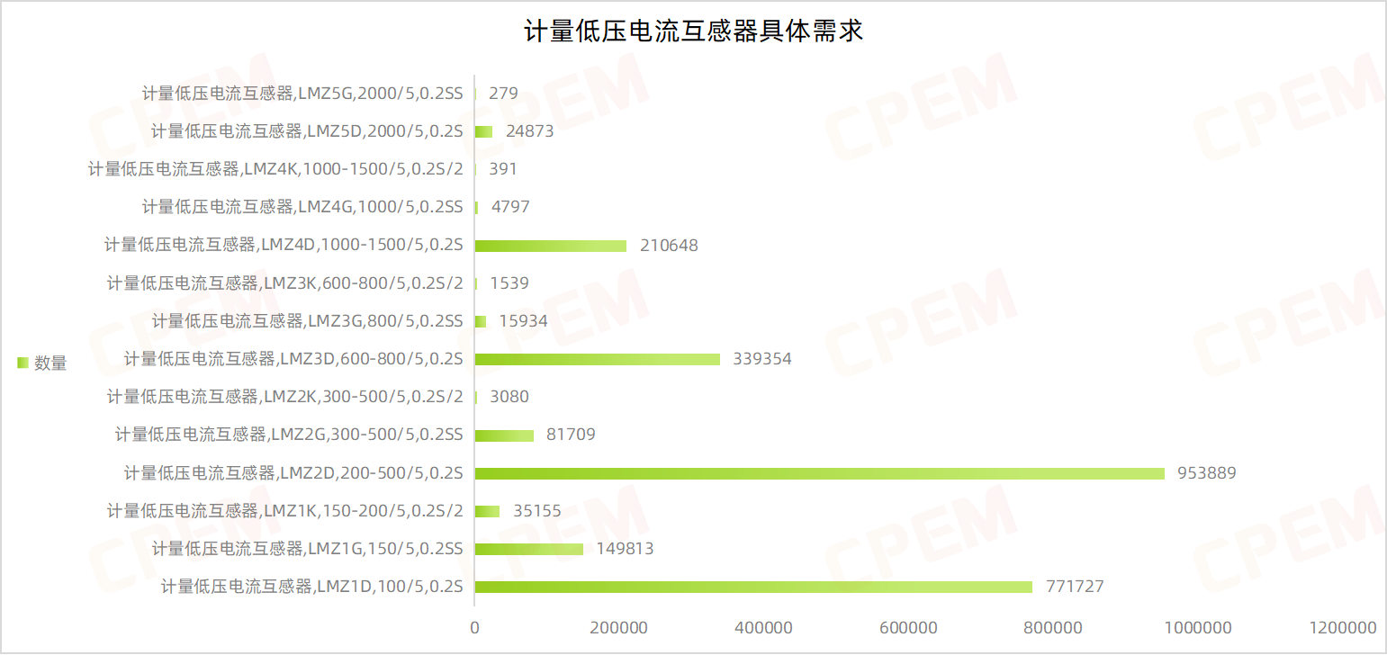 計量低壓電流互感器招標(biāo)項目單位共計21個,其國國網(wǎng)山東省電力公司、國網(wǎng)江蘇省電力有限公司、國網(wǎng)河北省電力有限公司三個項目單位需求數(shù)量分列前三,計量低壓電流互感器,LMZ2D,200-500/5,0.2S該款產(chǎn)品的需求量最大,達953889臺。