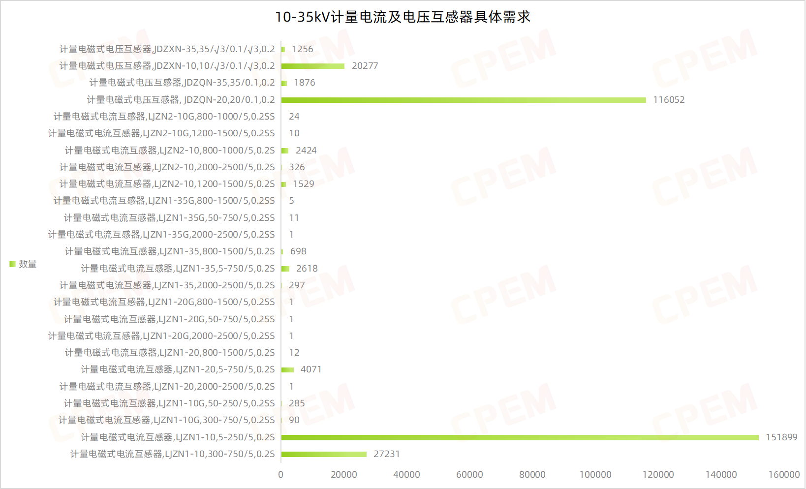 10-35kV計量電流及電壓互感器招標(biāo)項目單位共計16個,其國國網(wǎng)山東省電力公司、國網(wǎng)浙江省電力有限公司、國網(wǎng)江蘇省電力有限公司三個項目單位需求數(shù)量分列前三,計量電磁式電流互感器,LJZN1-10,5-250/5,0.2S和計量電磁式電壓互感器, JDZQN-20,20/0.1,0.2兩款產(chǎn)品的需求量遙遙領(lǐng)先,分別為151899臺和116052臺。