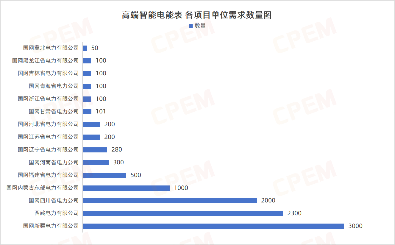 高端智能電能表招標(biāo)項目單位共計15個,其中國國網(wǎng)新疆電力有限公司、西藏電力有限公司、國網(wǎng)四川省電力公司三個項目單位需求數(shù)量分列前三,高端智能電能表,D級,3×57.7/100V,0.3A該款產(chǎn)品的需求量最大,為6316臺。