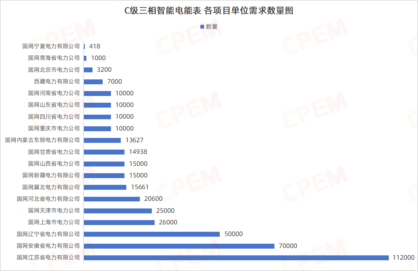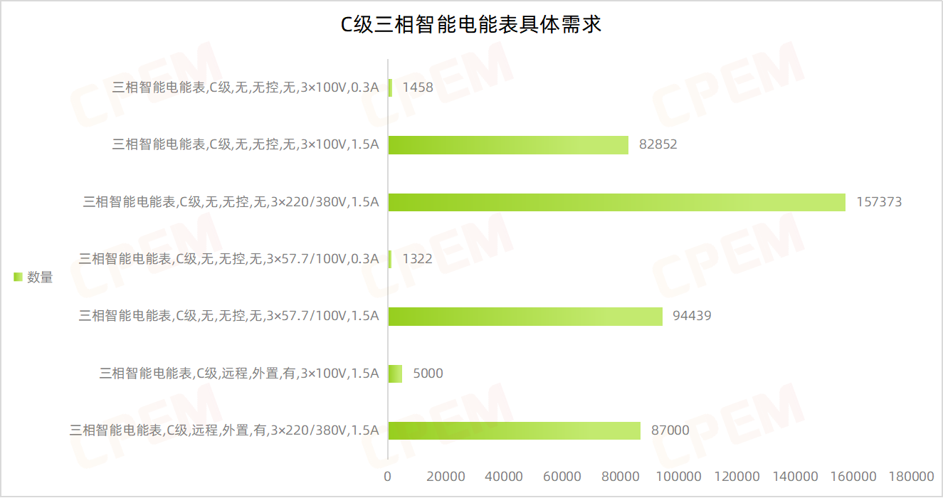 C級三相智能電能表招標(biāo)項目單位共計19個,其中國國網(wǎng)江蘇省電力有限公司、國網(wǎng)安徽省電力有限公司、國網(wǎng)遼寧省電力有限公司三個項目單位需求數(shù)量分列前三,三相智能電能表,C級,無,無控,無,3×220/380V,1.5A該款產(chǎn)品的需求量最大,達157373臺。