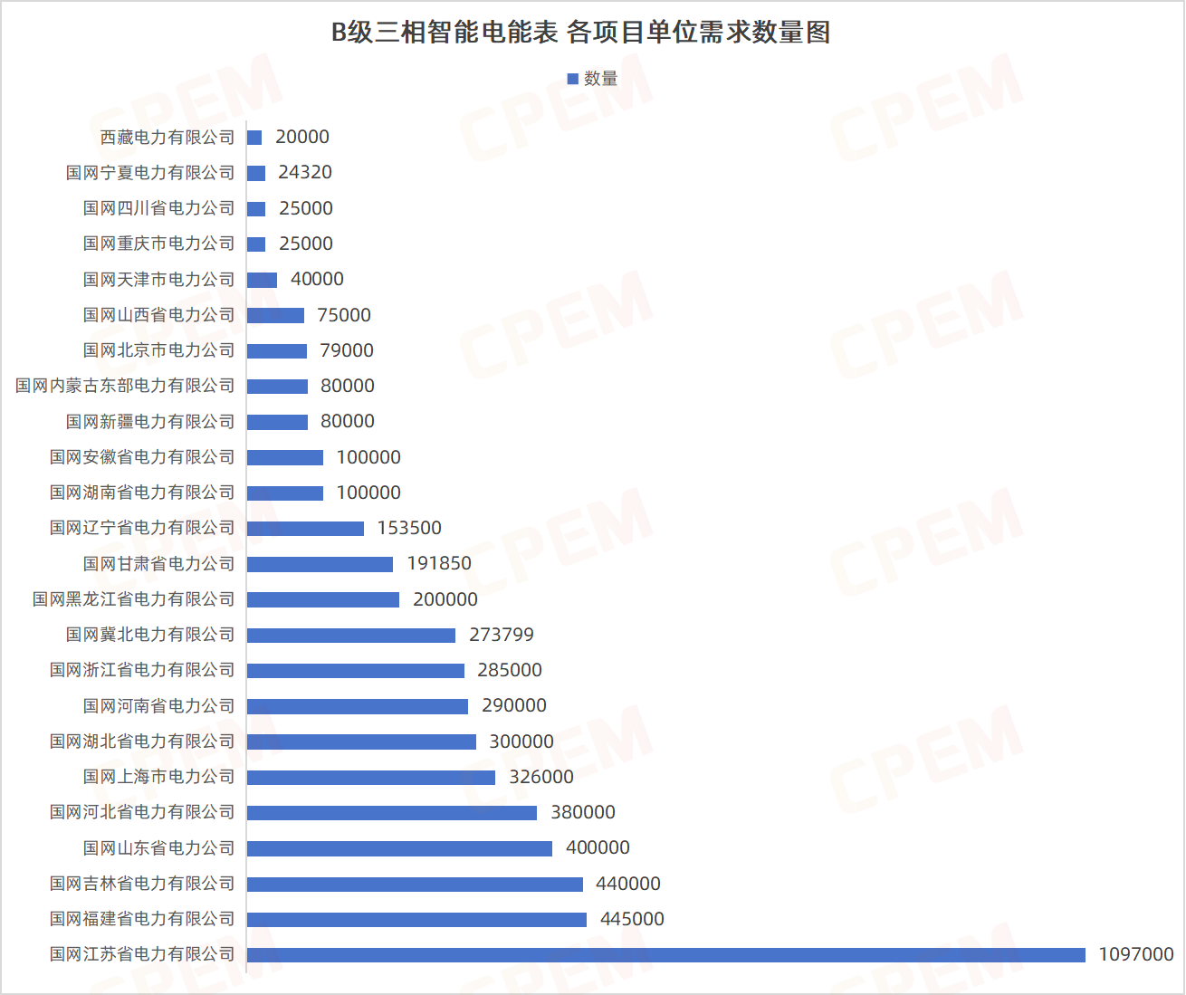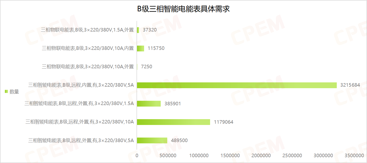 B級三相智能電能表招標(biāo)項目單位共計24個,其中國國網(wǎng)江蘇省電力有限公司、國網(wǎng)福建省電力有限公司、國網(wǎng)吉林省電力有限公司三個項目單位需求數(shù)量分列前三,三相智能電能表,B級,遠程,內(nèi)置,有,3×220/380V,5A該款產(chǎn)品的需求量最大,達3215684臺。