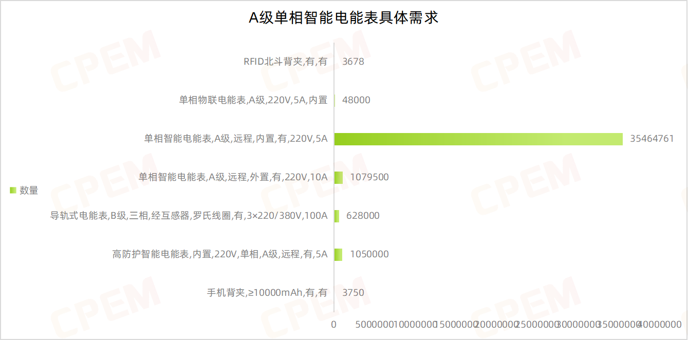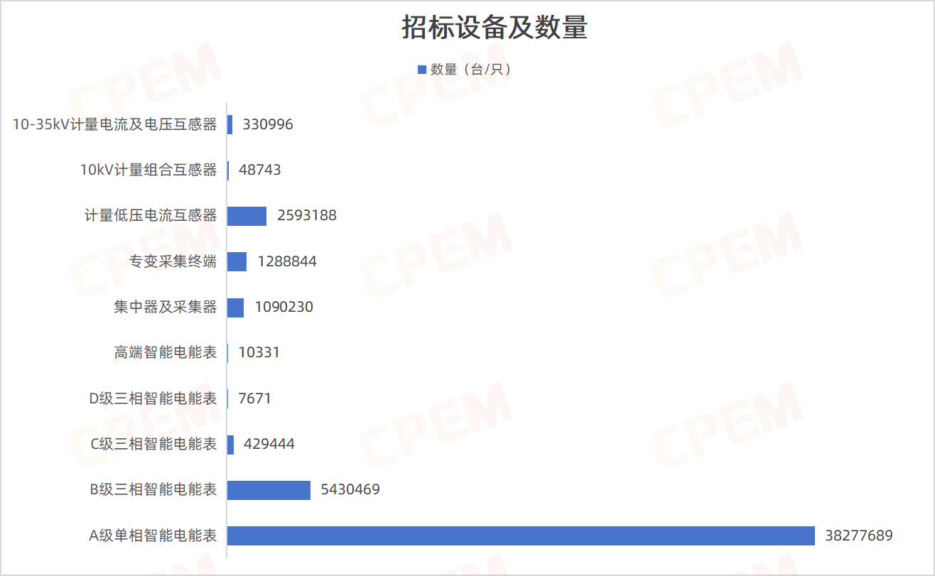 招標(biāo)合計采購設(shè)備49507605臺/只,其中A級單相智能電能表數(shù)量最多,達38277689臺;其次為B級三相智能電能表,5430469臺。