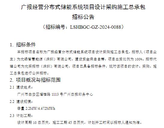 3月6日,光大環(huán)境發(fā)布了廣報經(jīng)營分布式儲能系統(tǒng)項目設計采購施工總承包招標公告,項目位于廣東省廣州市白云區(qū)增槎路1113號廣州日報印務中心,容量2.2MW/4.472MWh。