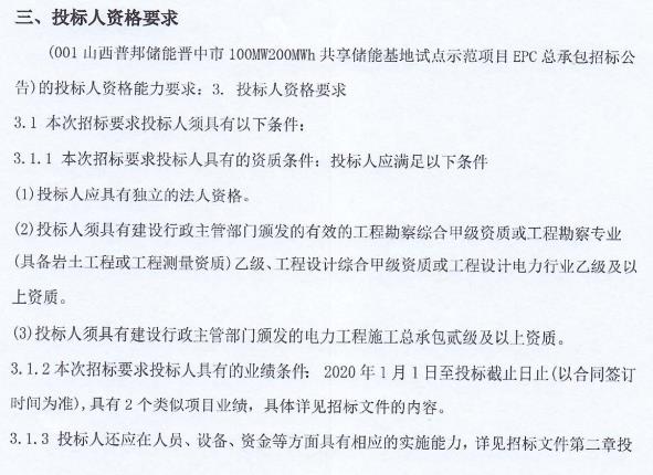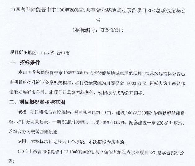 3月7日,山西普邦儲能晉中市100MW200MWh共享儲能基地試點示范項目EPC總承包招標(biāo)公告發(fā)布。項目總占地約 50 畝,建設(shè) 100MW/200MWh 磷酸鐵鋰儲能系統(tǒng)。項目分兩期建設(shè),一期50MW/100MWh,二期50MW/100MWh,配套建設(shè)一座220kV升壓站,及綜合辦公樓等基礎(chǔ)設(shè)施。