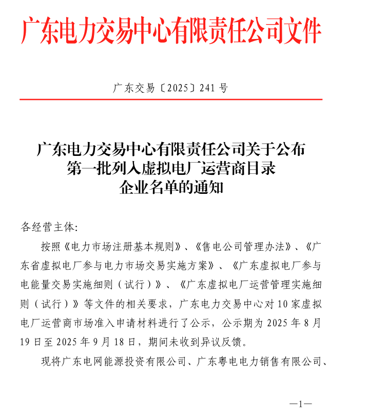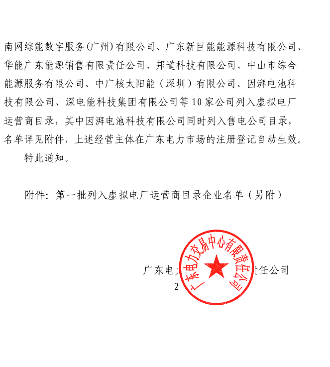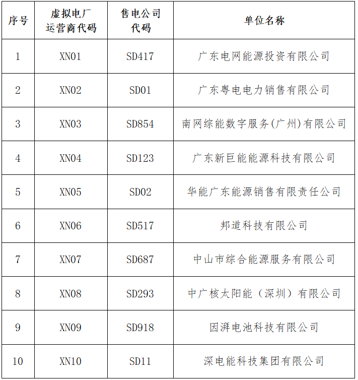 9月19日,廣東電力交易中心公布了第一批虛擬電廠運營商名錄,共有10家企業(yè)列入,廣東電網(wǎng)能源投資有限公司、廣東粵電電力銷售有限公司、南網(wǎng)綜能數(shù)字服務(廣州)有限公司、廣東新巨能能源科技有限公司、華能廣東能源銷售有限責任公司、邦道科技有限公司、中山市綜合能源服務有限公司、中廣核太陽能(深圳)有限公司、因湃電池科技有限公司、深電能科技集團有限公司。