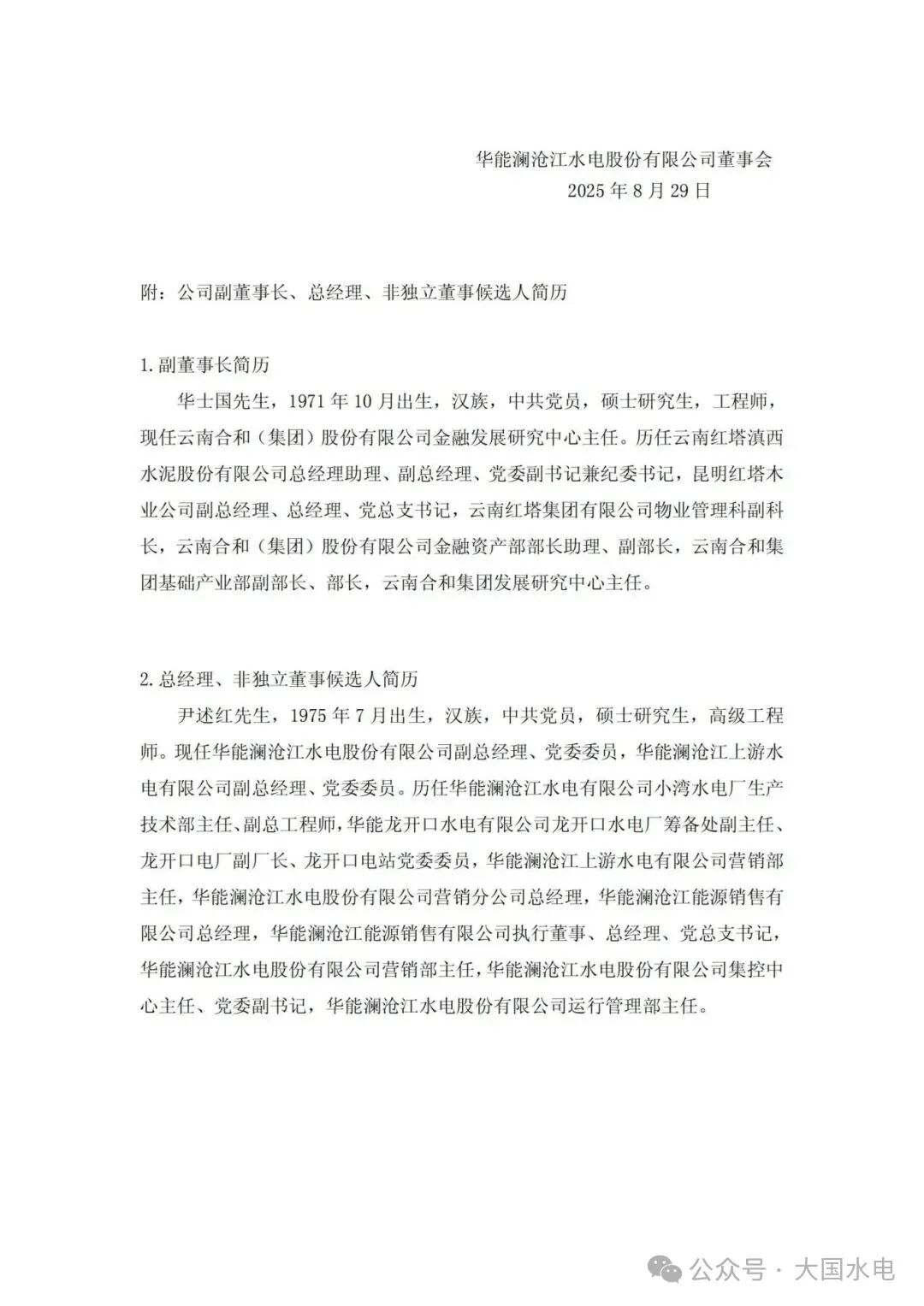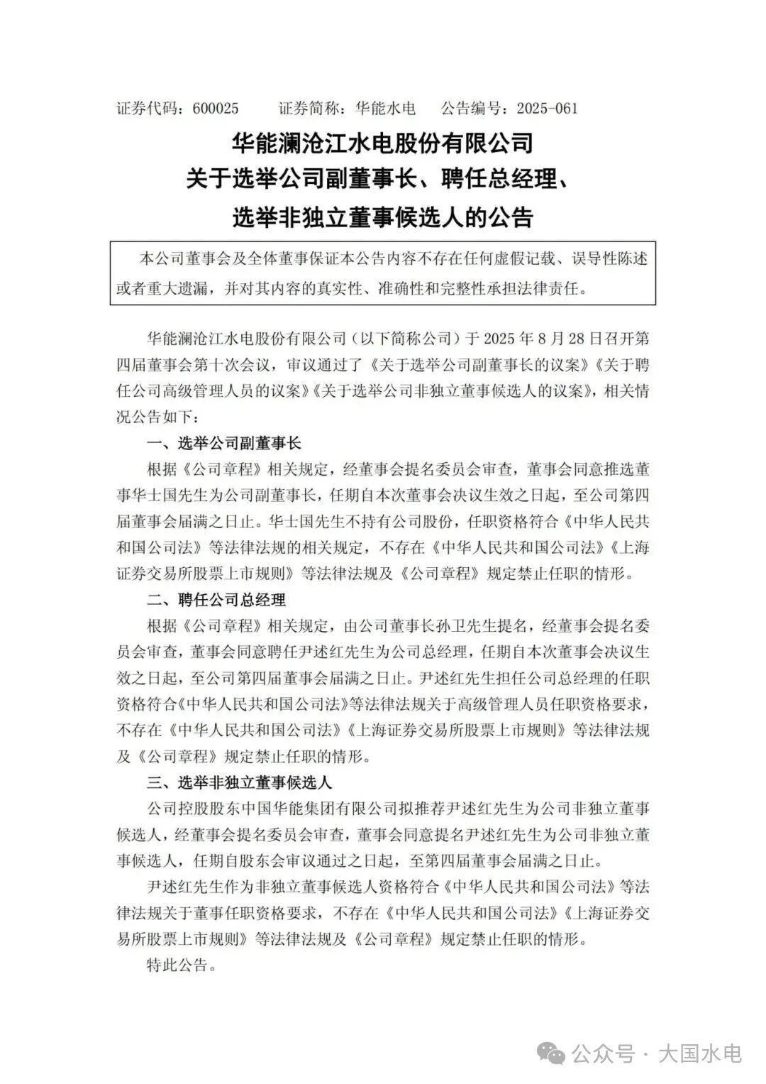 8月28日,華能瀾滄江水電股份有限公司(以下簡稱“華能水電”)公告稱,華能水電于8月28日召開第四屆董事會第十次會議,審議通過了《關于選舉公司副董事長的議案》《關于聘任公司高級管理人員的議案》《關于選舉公司非獨立董事候選人的議案》。