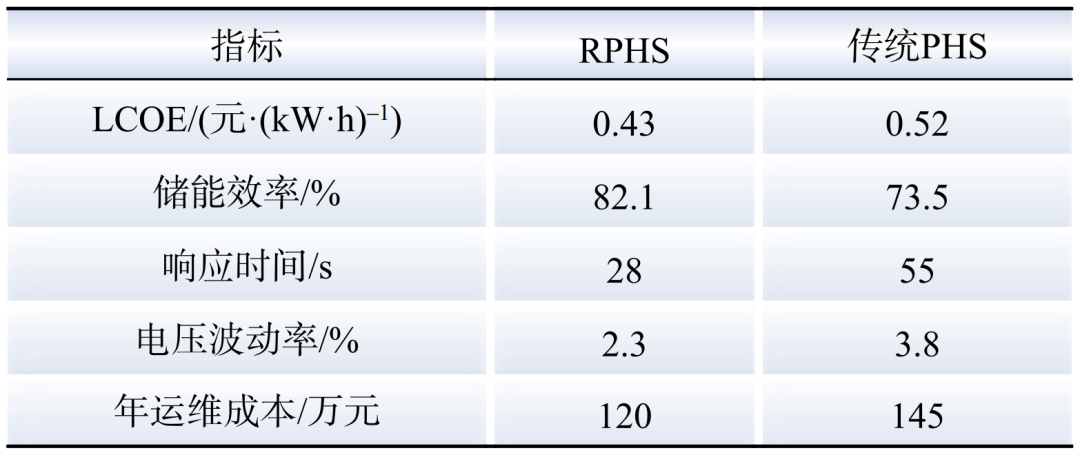 為驗(yàn)證所提RPHS協(xié)調(diào)優(yōu)化方法的綜合性能,本節(jié)增設(shè)兩組算例對(duì)比實(shí)驗(yàn),分別與傳統(tǒng)PHS及混合儲(chǔ)能系統(tǒng)(RPHS+BESS)進(jìn)行多維度性能對(duì)比。實(shí)驗(yàn)采用相同的歷史氣象數(shù)據(jù)及電網(wǎng)負(fù)荷參數(shù),確保結(jié)果可靠性。在固定光伏(8個(gè))與風(fēng)力渦輪機(jī)(6個(gè))配置條件下,對(duì)比RPHS與傳統(tǒng)PHS在相同水庫容量下的性能差異。實(shí)驗(yàn)結(jié)果如表2所示。從表2可以看出,RPHS憑借可逆泵渦輪雙向運(yùn)行特性,儲(chǔ)能效率提升11.7%,且響應(yīng)時(shí)間縮短至28 s,顯著優(yōu)于傳統(tǒng)PHS。此外,電壓波動(dòng)率降低39.5%,證明其在平抑新能源波動(dòng)性方面更具優(yōu)勢(shì)。因此,RPHS在提升儲(chǔ)能效率、縮短響應(yīng)時(shí)間及增強(qiáng)系統(tǒng)穩(wěn)定性方面具有顯著優(yōu)勢(shì),尤其適用于平抑新能源波動(dòng)性場(chǎng)景。
