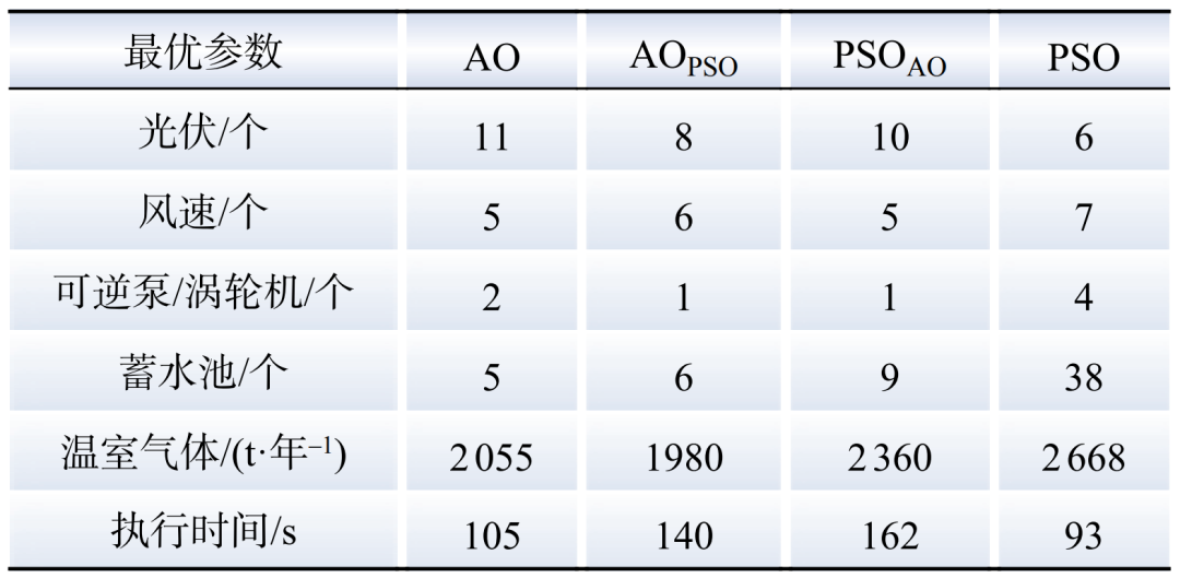 為了實(shí)現(xiàn)最小化LCOE,通過求解優(yōu)化問題來確定混合微電網(wǎng)組件的最佳容量。選擇相同的步長(zhǎng)及容量,對(duì)本文所提出的算法進(jìn)行驗(yàn)證。比較了4種優(yōu)化方法的最優(yōu)參數(shù)如表1所示。根據(jù)表1中決策變量的不同,可以發(fā)現(xiàn)混合優(yōu)化方法在執(zhí)行時(shí)間和成本方面比單獨(dú)使用任一算法更快地接近最優(yōu)解。