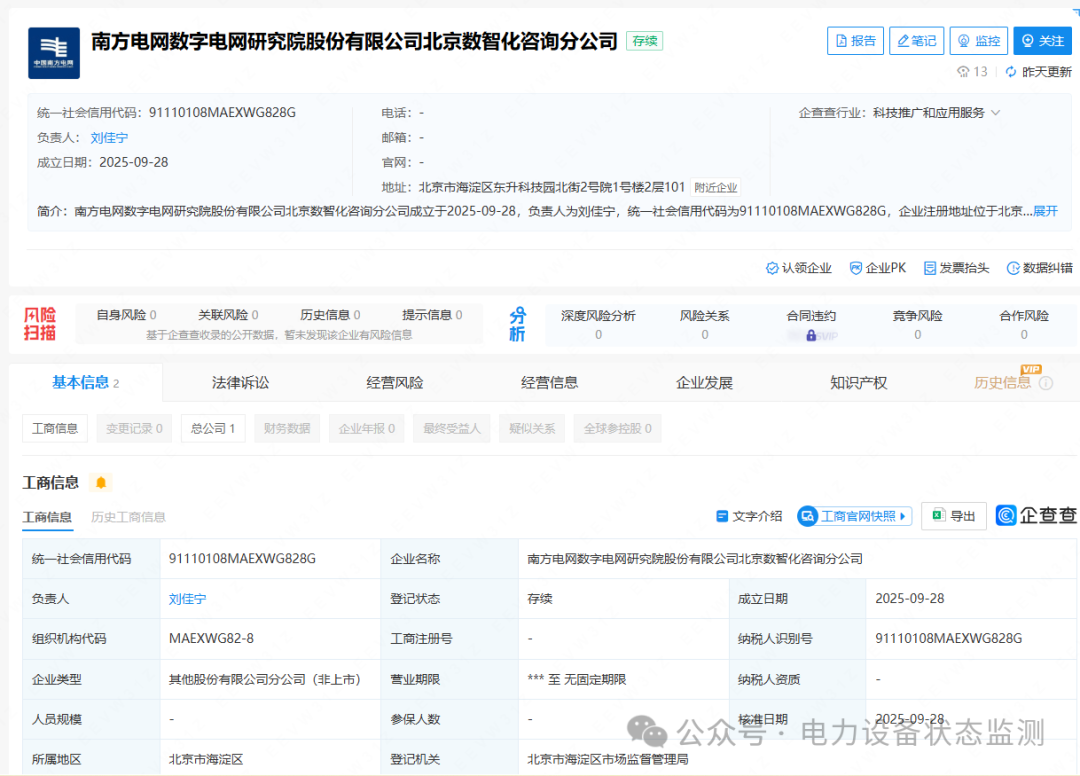 9月28日,南方電網(wǎng)數(shù)字電網(wǎng)研究院股份有限公司北京數(shù)智化咨詢分公司正式于北京注冊成立。作為南網(wǎng)數(shù)研院在北方地區(qū)戰(zhàn)略布局的關鍵一步,該公司更加聚焦國家科技創(chuàng)新解決方案與央國企數(shù)字化轉(zhuǎn)型賦能,打造國內(nèi)數(shù)智化高端咨詢頭部企業(yè)。