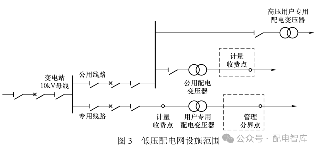 “管理分界點(diǎn)”主要針對專用配電變壓器或低壓用戶專線,因?yàn)榇嬖诓糠钟脩羝溆?jì)量收費(fèi)點(diǎn)可能位于配電變壓器低壓出口側(cè)或?qū)S门潆娮儔浩鞲邏哼M(jìn)線側(cè),距離實(shí)際負(fù)荷及計(jì)量收費(fèi)點(diǎn)尚有一定的距離。低壓配電網(wǎng)設(shè)施范圍如圖3所示。