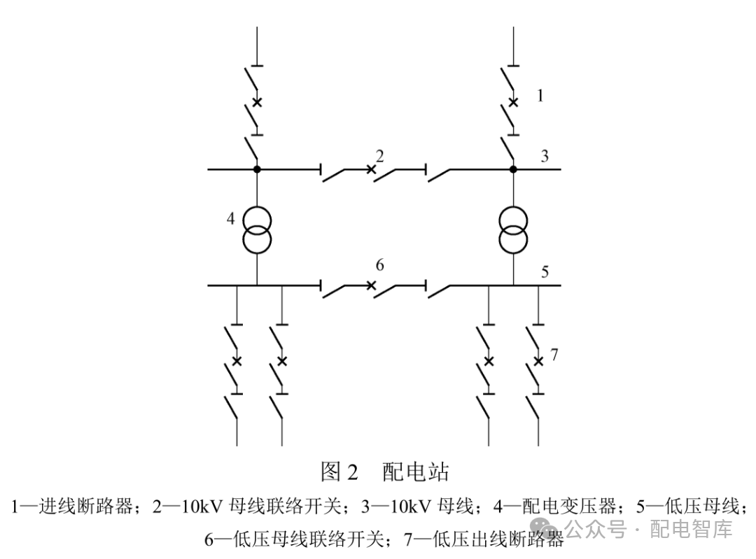 “設(shè)備集群”是指一組(若干個)相互獨(dú)立的設(shè)備,經(jīng)電氣連接組成的一個較大的設(shè)施,其中每個集群設(shè)備都可以獨(dú)立運(yùn)行。這些設(shè)備的功能可以相同,也可以不同,共同對外提供電能傳輸、變換及分配中的一種或多種功能,通??梢砸詥我幌到y(tǒng)模式加以管理。例如圖2所示,配電站由進(jìn)線斷路器、10kV母線、10kV母線聯(lián)絡(luò)開關(guān)、配電變壓器、低壓母線、低壓母線聯(lián)絡(luò)開關(guān)及低壓出線斷路器構(gòu)成,這組設(shè)備集群共同實(shí)現(xiàn)配電室的電能變換及分配功能。