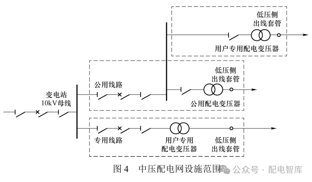 本導(dǎo)則采用“公用中壓配電網(wǎng)設(shè)施+專用中壓配電網(wǎng)設(shè)施”組合方式,對中壓配電網(wǎng)設(shè)施進(jìn)行定義。具體中壓配電網(wǎng)設(shè)施范圍如圖4所示。