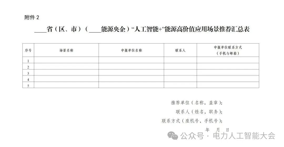 4.請各省級能源主管部門、中央企業(yè)于2025年12月29日前將高價值應(yīng)用場景申報書(詳見附件1)、推薦匯總表(詳見附件2)蓋章件一式三份紙質(zhì)版及電子版(光盤刻錄)寄送至國家能源局科技司。申報場景命名規(guī)則為“推薦地區(qū)/單位名稱-序號-場景名稱”(序號與推薦匯總表一致)。