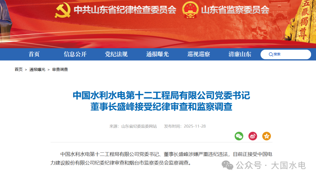 據(jù)“山東省紀(jì)委監(jiān)委網(wǎng)站”微信公號(hào)11月28日下午發(fā)布的消息,中國(guó)水利水電第十二工程局有限公司黨委書(shū)記、董事長(zhǎng)盛峰涉嫌嚴(yán)重違紀(jì)違法,目前正接受中國(guó)電力建設(shè)股份有限公司紀(jì)委紀(jì)律審查和煙臺(tái)市監(jiān)察委員會(huì)監(jiān)察調(diào)查。