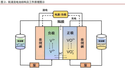 工作原理:利用不同價(jià)態(tài)的釩離子在電解液中發(fā)生氧化還原反應(yīng),儲(chǔ)存和釋放能量。實(shí)際上因?yàn)殁C是一個(gè)多價(jià)態(tài)的元素,顧名思義是兩側(cè)有不同價(jià)態(tài)的釩離子,通過正負(fù)極這種價(jià)態(tài)的變化,實(shí)現(xiàn)得失電子和充電放電的過程。