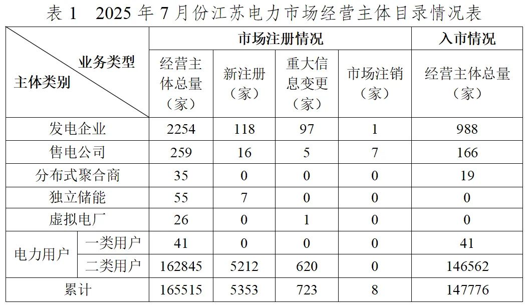 截至2025年7月31日,江蘇電力市場(chǎng)經(jīng)營(yíng)主體共計(jì)165515家,其中發(fā)電企業(yè)2254家,售電公司259家,分布式聚合商35家,獨(dú)立儲(chǔ)能企業(yè)55家,虛擬電廠26家,電力用戶162886家(一類(lèi)用戶41家,二類(lèi)用戶162845家)。