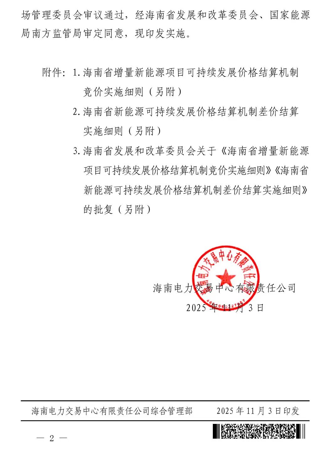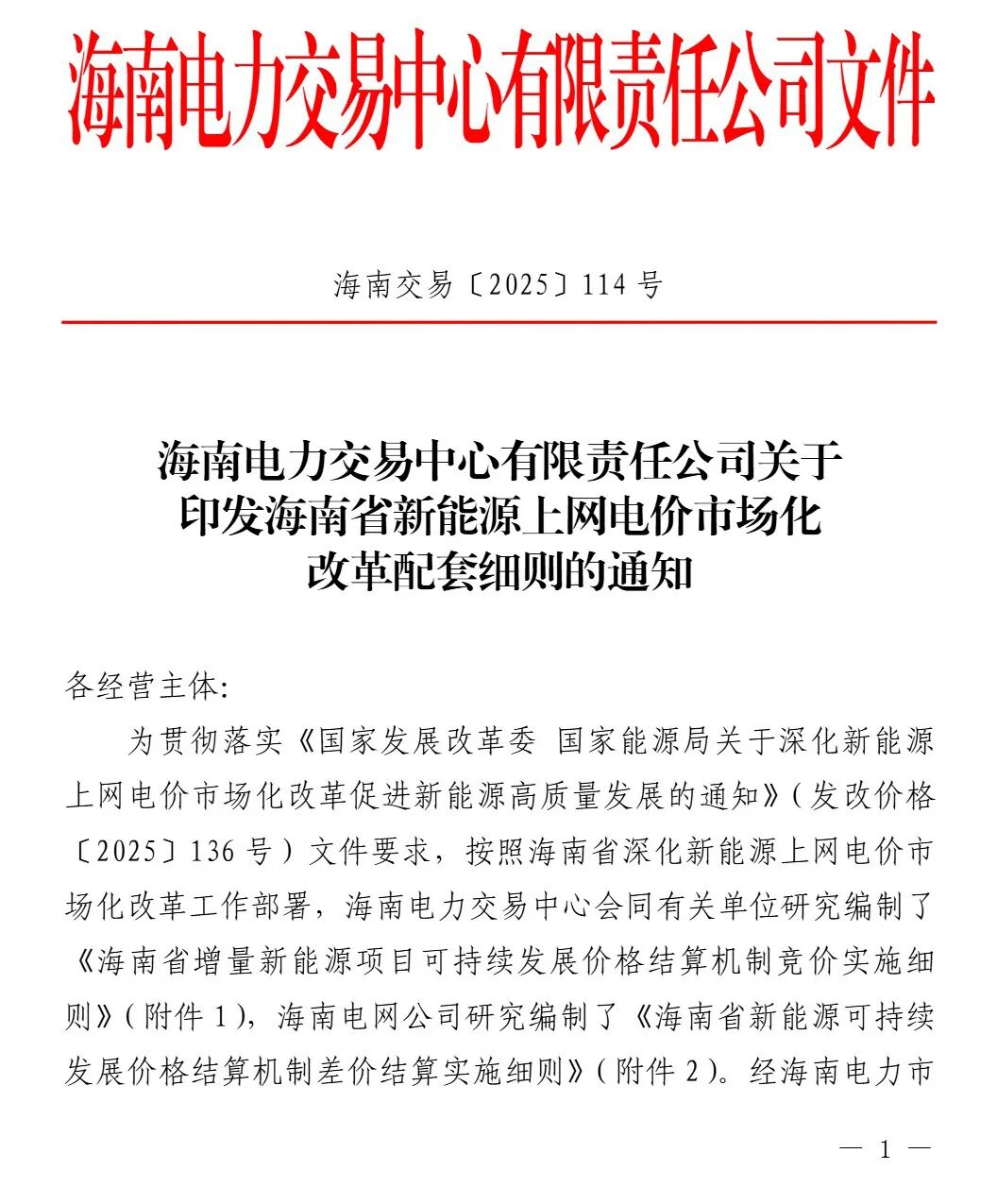 11月3日,海南電力交易中心印發(fā)海南省新能源上網(wǎng)電價(jià)市場(chǎng)化改革配套細(xì)則的通知,實(shí)施細(xì)則提到,適用于2025年6月1日及以后投產(chǎn)的且未納入機(jī)制執(zhí)行范圍的新能源項(xiàng)目(風(fēng)電、太陽(yáng)能發(fā)電項(xiàng)目,下同)。