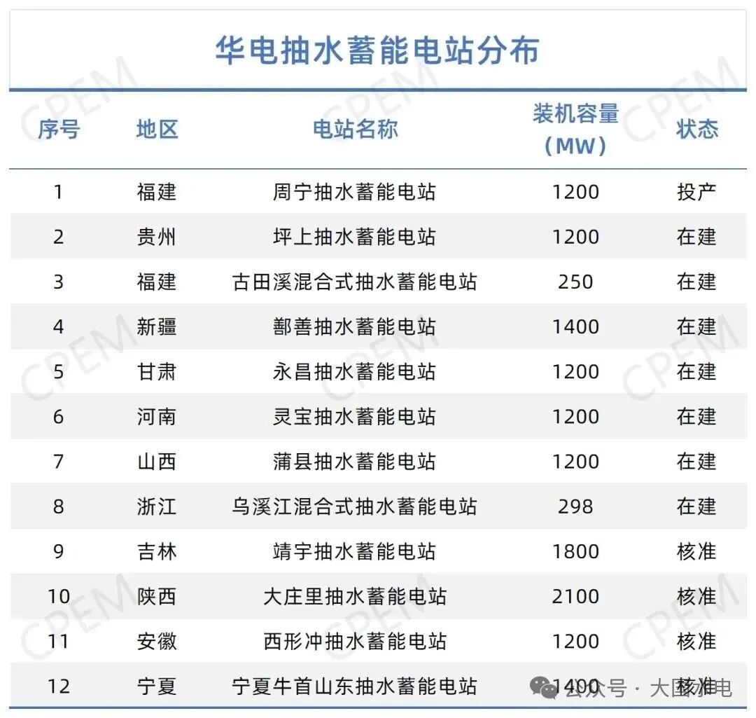 據(jù)CPEM大國水電統(tǒng)計,截至2025年6月,華電在運及在建/核準抽水蓄能電站12座,總裝機容量約14.45GW。
