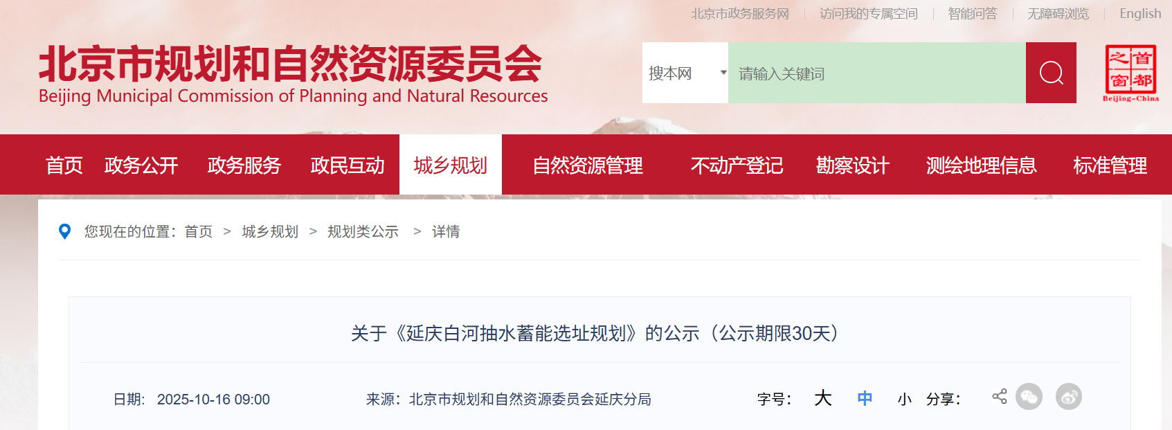 2025年10月16日,北京市規(guī)劃和自然資源委員會延慶分局對延慶白河抽水蓄能電站項目的選址規(guī)劃進行了公示。根據(jù)公示信息,項目位于延慶區(qū)千家店鎮(zhèn)六道河村西部,上水庫建于黃木溝,下水庫利用賓榔溝的地形建設。該電站規(guī)劃裝機容量為100萬千瓦(1000MW),是一座大型抽水蓄能電站,總用地面積約140.29公頃(具體指標以最終審批方案為準)。