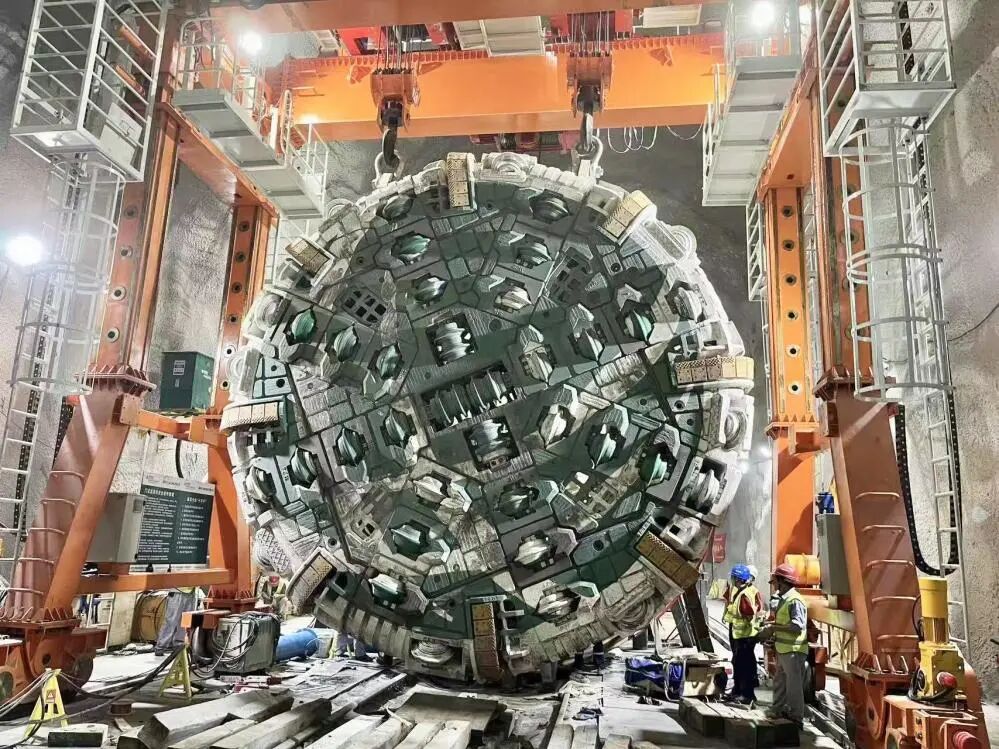 2024年8月8日,可變徑斜井TBM“天岳號”在國網(wǎng)新源平江電站組裝完成。