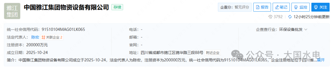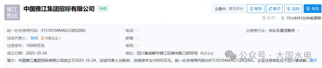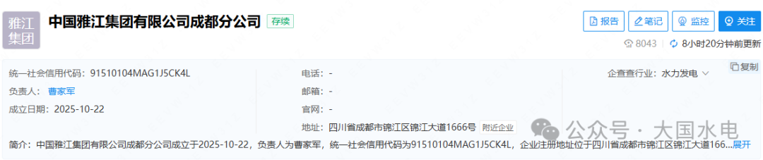 CPEM全國電力設(shè)備管理網(wǎng)獲悉,截止2025年10月26日,中國雅江集團有限公司(以下簡稱“雅江集團”)已注冊成立8家公司。其中,北京1家、西藏4家、四川3家。