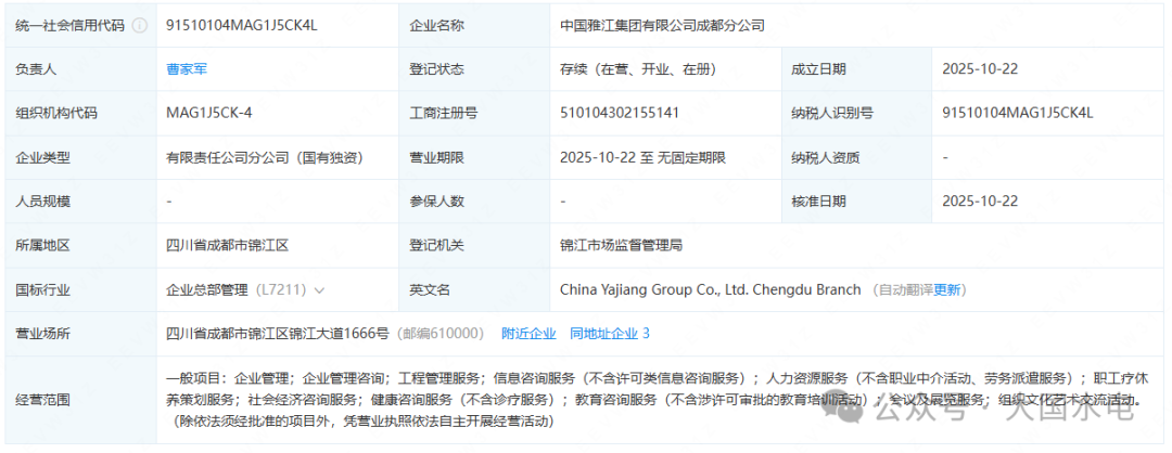 10月22日,中國雅江集團有限公司成都分公司成立,負責人:曹家軍,企業(yè)類型:有限責任公司分公司(國有獨資),注冊地址:四川省成都市錦江區(qū)錦江大道1666號。經(jīng)營范圍:一般項目:企業(yè)管理;企業(yè)管理咨詢;工程管理服務(wù);信息咨詢服務(wù)(不含許可類信息咨詢服務(wù));人力資源服務(wù)(不含職業(yè)中介活動、勞務(wù)派遣服務(wù));職工療休養(yǎng)策劃服務(wù);社會經(jīng)濟咨詢服務(wù);健康咨詢服務(wù)(不含診療服務(wù));教育咨詢服務(wù)(不含涉許可審批的教育培訓活動);會議及展覽服務(wù);組織文化藝術(shù)交流活動。(除依法須經(jīng)批準的項目外,憑營業(yè)執(zhí)照依法自主開展經(jīng)營活動)