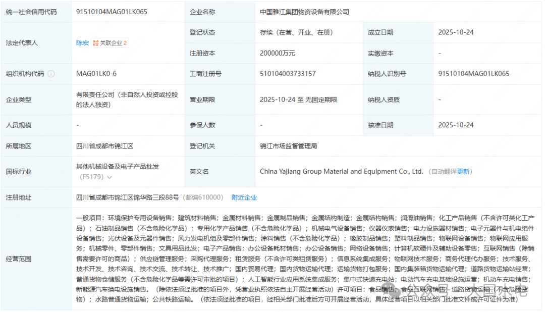 10月24日,中國雅江集團物資設(shè)備有限公司成立,負責人:陳宏,注冊地址:四川省成都市錦江區(qū)錦華路三段88號。經(jīng)營范圍:一般項目:環(huán)境保護專用設(shè)備銷售;建筑材料銷售;金屬材料銷售;金屬制品銷售;金屬結(jié)構(gòu)制造;金屬結(jié)構(gòu)銷售;潤滑油銷售;化工產(chǎn)品銷售(不含許可類化工產(chǎn)品);石油制品銷售(不含危險化學品);專用化學產(chǎn)品銷售(不含危險化學品);機械電氣設(shè)備銷售;儀器儀表銷售;電力設(shè)施器材銷售;電子元器件與機電組件設(shè)備銷售;光伏設(shè)備及元器件銷售;風力發(fā)電機組及零部件銷售;涂料銷售(不含危險化學品);橡膠制品銷售;塑料制品銷售;物聯(lián)網(wǎng)設(shè)備銷售;物聯(lián)網(wǎng)應用服務(wù);機械零件、零部件銷售;文具用品批發(fā);電子產(chǎn)品銷售;辦公設(shè)備耗材銷售;辦公設(shè)備銷售;網(wǎng)絡(luò)設(shè)備銷售;計算機軟硬件及輔助設(shè)備零售;互聯(lián)網(wǎng)銷售(除銷售需要許可的商品);供應鏈管理服務(wù);采購代理服務(wù);租賃服務(wù)(不含許可類租賃服務(wù));信息系統(tǒng)集成服務(wù);物聯(lián)網(wǎng)技術(shù)服務(wù);商務(wù)代理代辦服務(wù);技術(shù)服務(wù)、技術(shù)開發(fā)、技術(shù)咨詢、技術(shù)交流、技術(shù)轉(zhuǎn)讓、技術(shù)推廣;國內(nèi)貿(mào)易代理;國內(nèi)貨物運輸代理;運輸貨物打包服務(wù);國內(nèi)集裝箱貨物運輸代理;道路貨物運輸站經(jīng)營;普通貨物倉儲服務(wù)(不含危險化學品等需許可審批的項目);人工智能行業(yè)應用系統(tǒng)集成服務(wù);集中式快速充電站;電動汽車充電基礎(chǔ)設(shè)施運營;機動車充電銷售;新能源汽車換電設(shè)施銷售。(除依法須經(jīng)批準的項目外,憑營業(yè)執(zhí)照依法自主開展經(jīng)營活動)許可項目:食品銷售;食品互聯(lián)網(wǎng)銷售;道路貨物運輸(不含危險貨物);水路普通貨物運輸;公共鐵路運輸。(依法須經(jīng)批準的項目,經(jīng)相關(guān)部門批準后方可開展經(jīng)營活動,具體經(jīng)營項目以相關(guān)部門批準文件或許可證件為準)