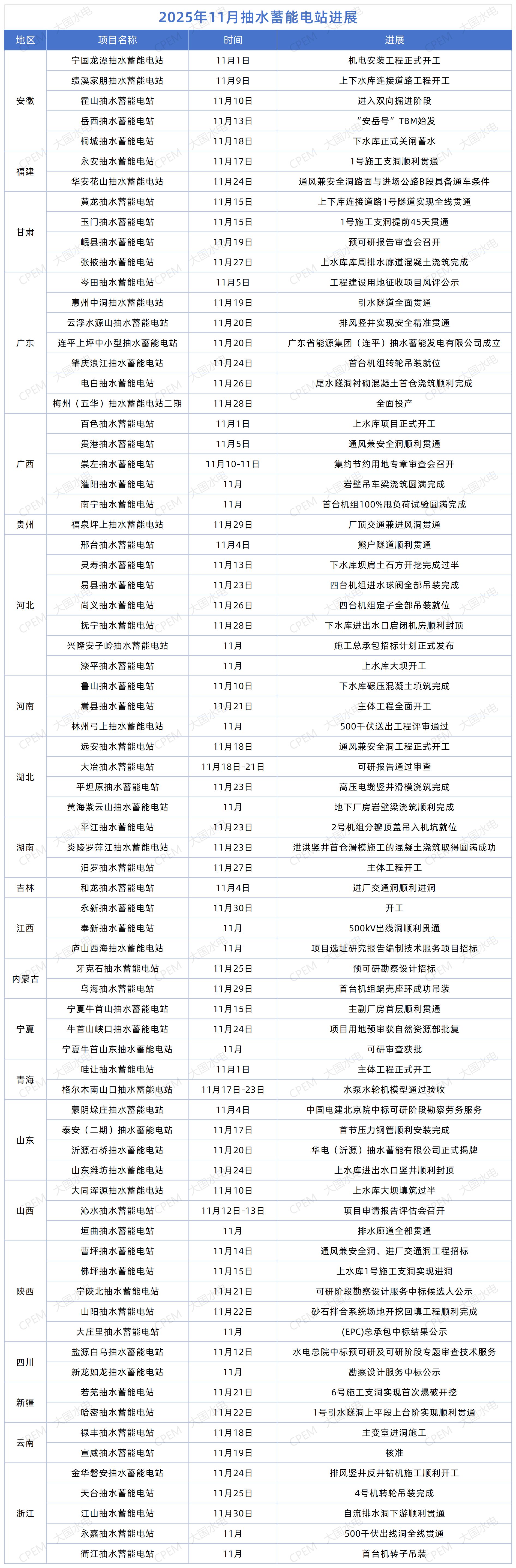 2025年11月,全國75座抽水蓄能電站取得重要進展,涵蓋開工、投產(chǎn)、核準、可研審查等。其中梅蓄二期全面投產(chǎn),永新抽蓄開工,宣威抽蓄核準,湖南汨羅抽蓄、青海哇讓抽蓄、河南嵩縣抽蓄等電站主體工程開工,具體如下: