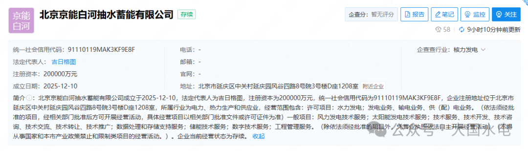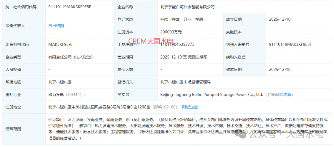 【CPEM大國水電】獲悉,2025年12月10日,京能集團(tuán)新成立一家全資子公司北京京能白河抽水蓄能有限公司,注冊資本20億元,注冊地位于北京市延慶區(qū),由京能集團(tuán)100%控股。