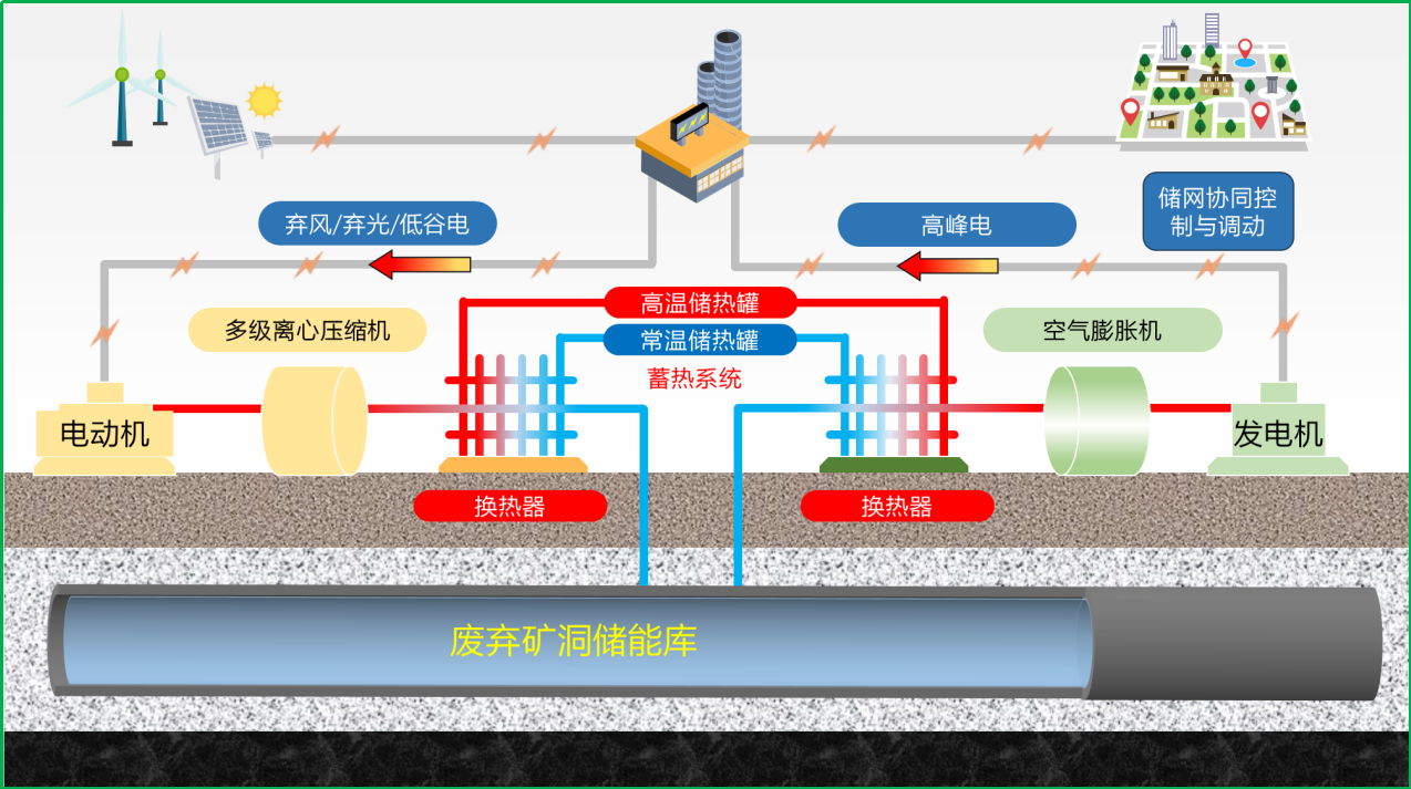 儲能環(huán)節(jié):壓縮空氣儲能系統(tǒng)在用電低谷或電力過剩時,利用風電/光電或電網(wǎng)負荷低谷期的電能帶動壓縮機,將電能轉(zhuǎn)化為空氣壓力能,隨后高壓空氣被密封存儲于報廢礦井(電能→勢能);